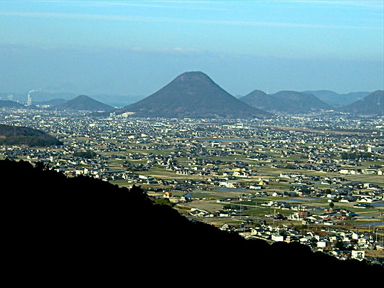 香川県の飯山町、丸亀市、坂出市にまたがる飯野山(讃岐富士)。標高422mの小さな山だが、その均整の撮れた美しい形がどこから見ても印象的である。写真は香川県琴平の金比羅宮前から見たもの。